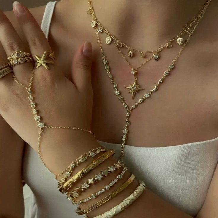 Illuminate your style with the Celestial Charm Luxe Set, a beautifully curated combination of layered necklaces, star-studded bracelets, and coordinating rings. Designed in radiant gold tones, each piece features delicate celestial motifs — stars, moons, and shimmering stones — creating a dreamy, modern goddess aesthetic.