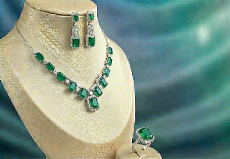 The sleek chain design highlights the bold beauty of each emerald stone, creating a graceful, balanced look that suits both grand celebrations and intimate occasions. The matching earrings and statement ring complete the ensemble, offering a polished and coordinated finish.