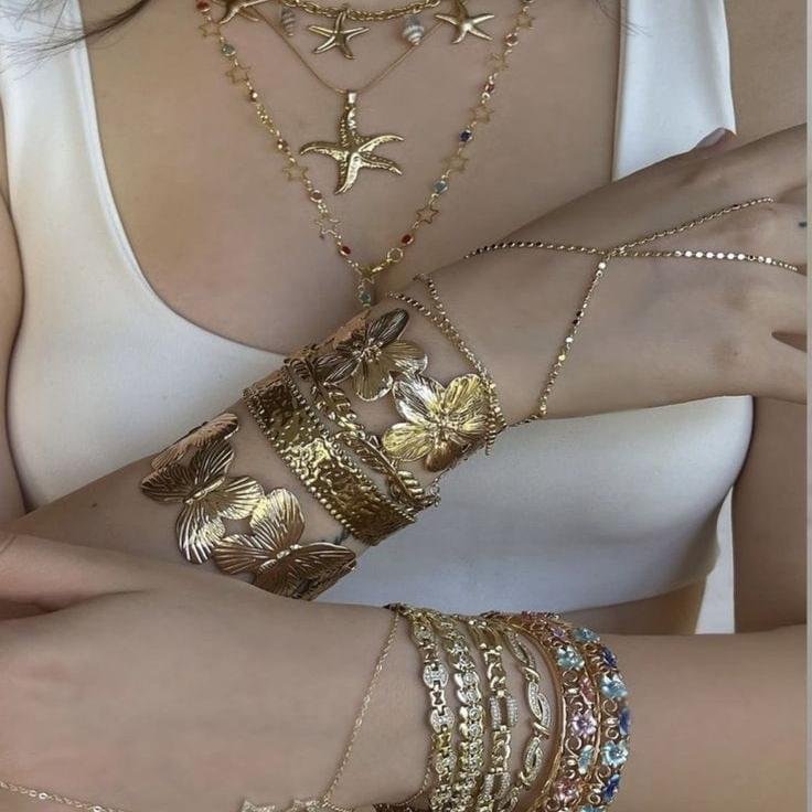 A breathtaking fusion of ocean-inspired motifs and floral elegance, this collection features handcrafted gold-toned cuffs, layered bracelets, and delicate hand chains. Each piece radiates luxury and effortless charm, perfect for beach vacations, festive looks, photoshoots, and chic everyday styling.