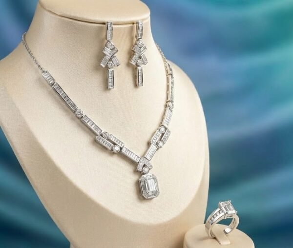 The necklace showcases a graceful symmetrical design, seamlessly complemented by cascading geometric earrings and a matching statement ring.