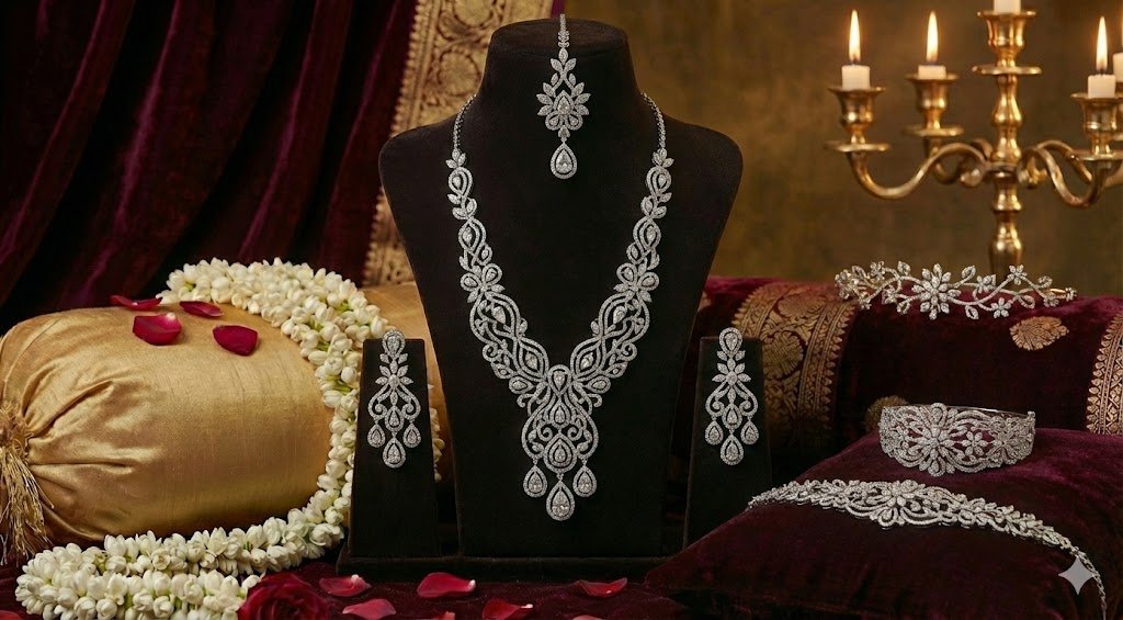 Perfect for brides who desire a poised and queenly presence, this set shines beautifully against rich bridal attire, making every moment feel regal, luxurious, and unforgettable.