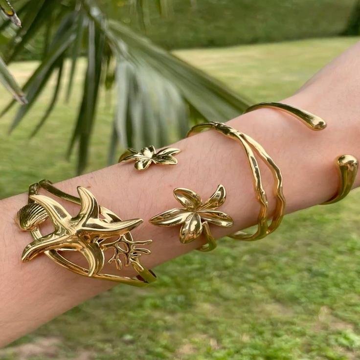 Elevate your style with this exquisite gold-toned floral cuff bracelet, beautifully sculpted to resemble blooming petals and organic natural curves. The high-polish finish gives it a radiant shine, while the open adjustable design ensures a perfect and comfortable fit. This nature-inspired statement piece is perfect for festive looks, resort wear, photoshoots, and everyday luxury styling.