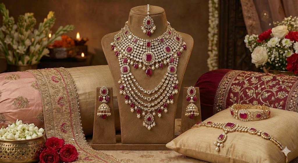This magnificent ensemble features a grand multi-layered necklace adorned with lustrous Polki diamonds, deep ruby stones, and delicate pearl droplets. The intricately detailed tiers drape elegantly across the neckline, creating a statement of timeless opulence. Complementing the necklace are ornate chandbali earrings, a traditional maang tikka, and a stunning ruby-studded haathphool and bracelet—each piece echoing the same majestic craftsmanship.