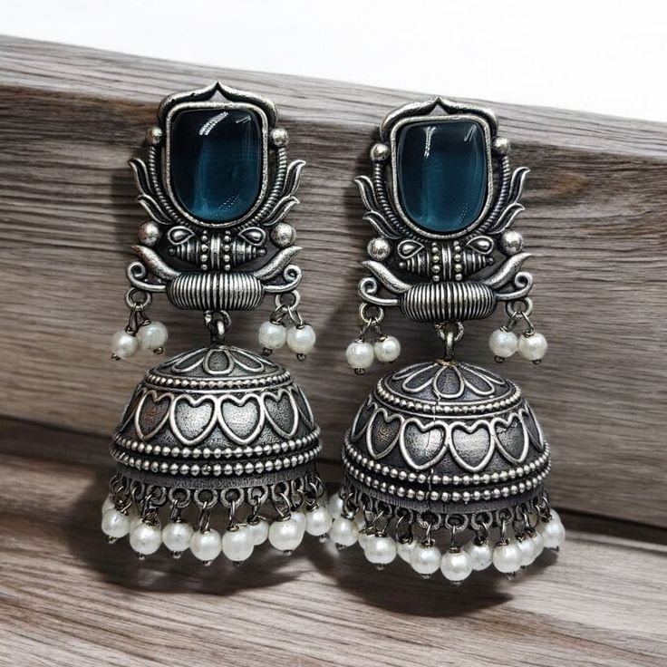 Crafted with precision, these heritage-style jhumkas showcase a bold blue stone centerpiece, ornate oxidised detailing, and a dome adorned with heart engravings. The pearl drops enhance their charm, making them perfect for festive and wedding looks.